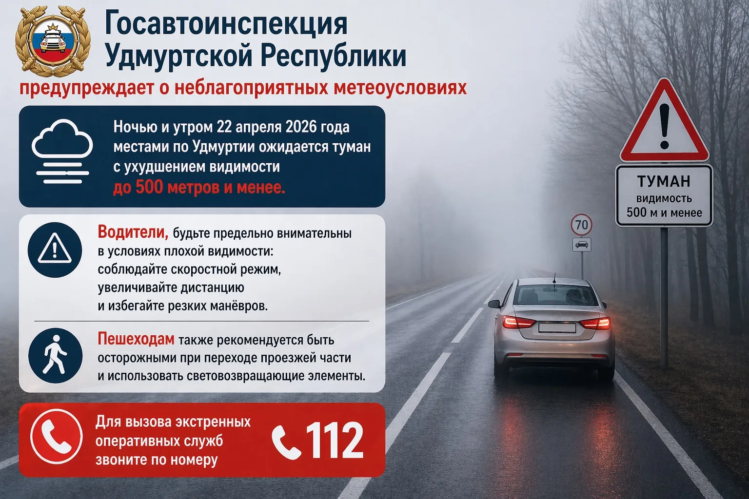 Госавтоинспекция Удмуртской Республики предупреждает о неблагоприятных метеоусловиях.