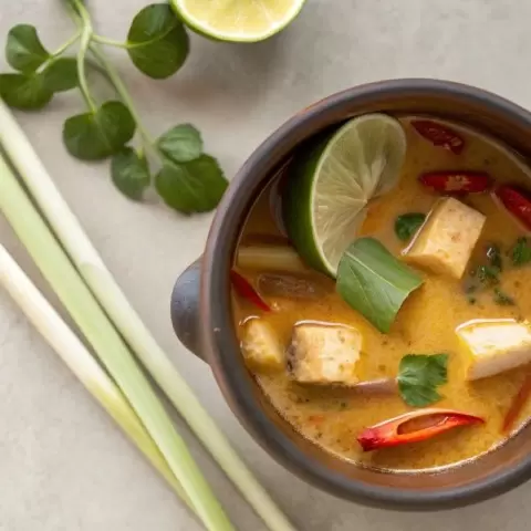 Сначала обжарьте лемонграсс и галангал в кокосовом молоке, добавьте тофу и чили, варите десять минут, затем влейте сок лайма и соевый соус. Подавайте с долькой лайма — и наслаждайтесь!