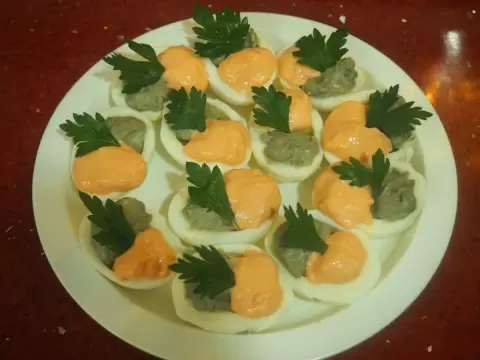 Общий процесс занимает примерно 30 минут. Начать следует с варки яиц: их необходимо отварить, охладить и аккуратно очистить. Каждое яйцо делится на две половины, и желтки тщательно вынимаются.