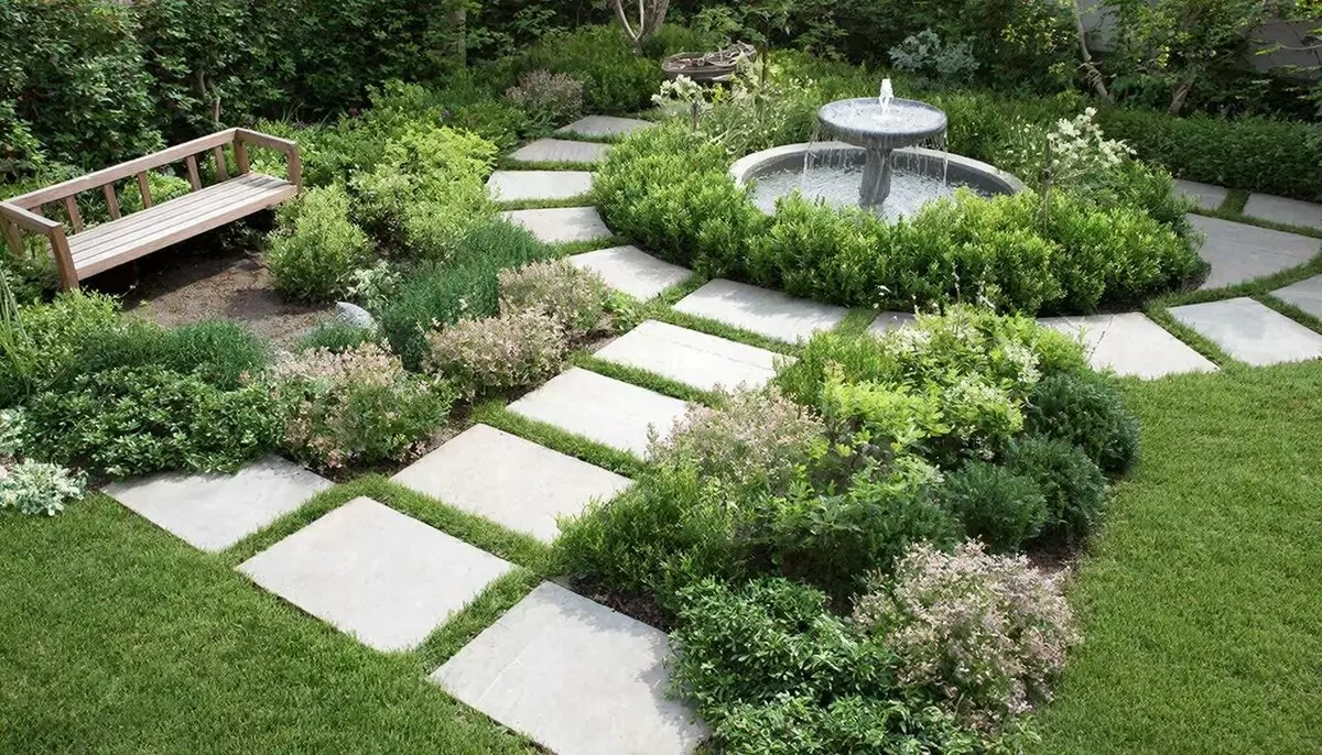 - Дорожки — узкие и плавные, формирующие впечатление глубины.