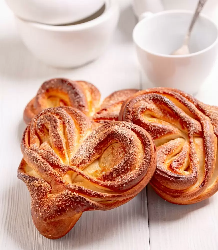 Сначала растопить 50 г сливочного масла и оставить его остывать до теплого состояния. В подогретом молоке растворить дрожжи, соль и половину сахара.В отдельной миске взбить яйцо с оставшимся сахаром, добавить дрожжевую смесь, растопленное масло и ванильную эссенцию. Хорошо перемешать.Постепенно добавить муку, замешивая тесто сначала ложкой, а затем на столе. Вымешивать 5–6 минут до получения эластичного шара.Положить тесто в смазанную растительным маслом миску, накрыть пленкой и оставить в теплом месте на 1–1,5 часа до увеличения в объеме в 2–3 раза.Обмять подошедшее тесто и разделить его на 8–10 равных кусков, накрыв полотенцем.Раскатать каждый кусок в тонкий пласт, смазать мягким маслом, присыпать сахаром и свернуть в рулет.Согнуть рулет пополам и сделать глубокий надрез, развернув обе половинки для формирования «сердечка».Выложить булочки на противень и оставить на 15–20 минут для расстойки. Перед выпеканием смазать смесью желтка и сметаны.Поместить в разогретую до 180–190°C духовку на 20–25 минут до золотистого цвета. Подавайте теплые!Наслаждайтесь этим сладким подарком своим родным! Приятного аппетита!