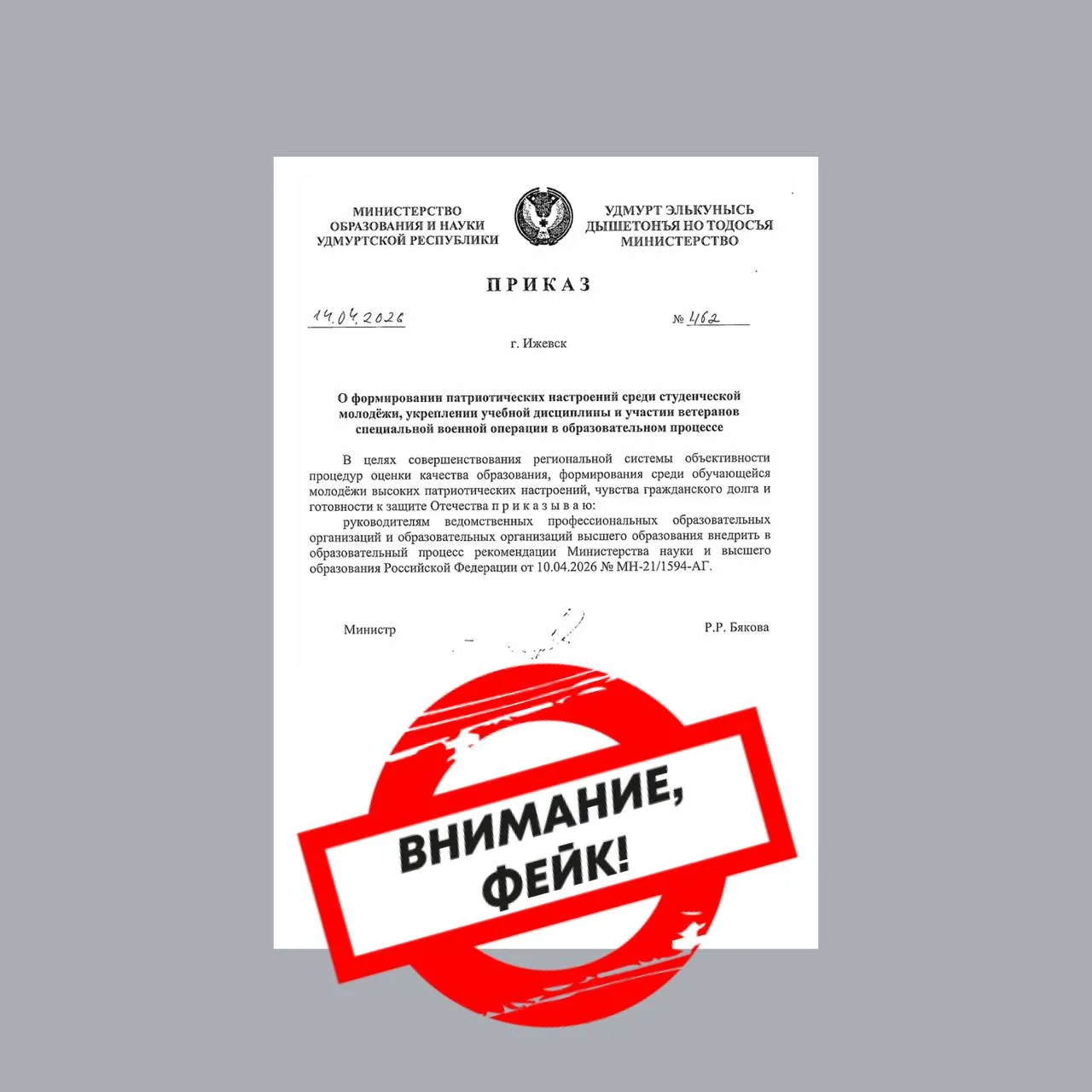 В Центре управления регионом (ЦУР) Удмуртии развенчали очередной фейк. На этот раз в соцсетях обнаружили поддельный «приказ» министерства образования и науки республики.