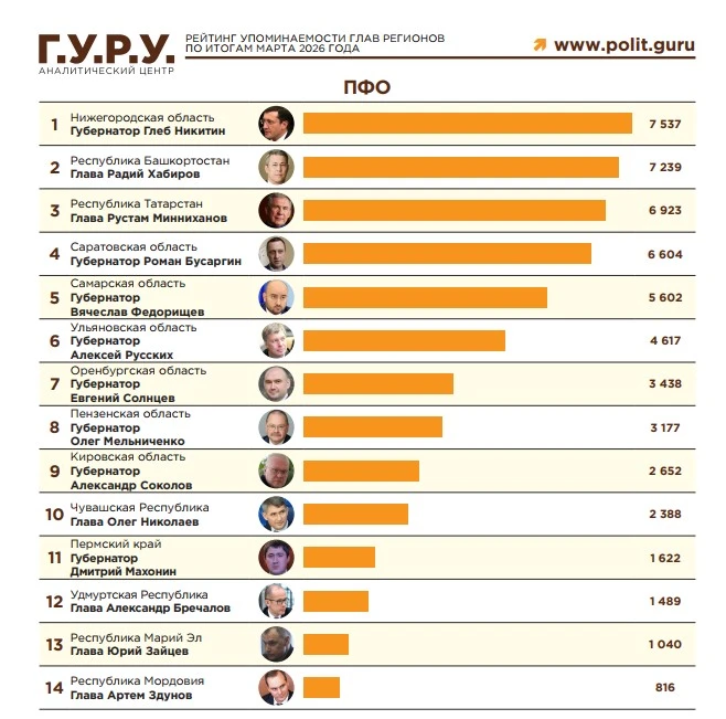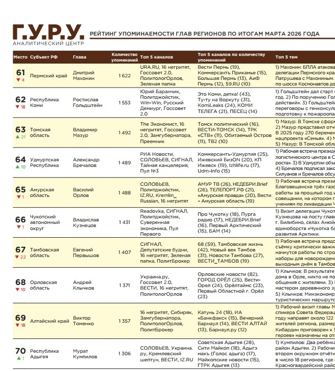 64-е место занял глава Удмуртии Александр Бречалов в рейтинге упоминаемости губернаторов по итогам марта 2026 года.