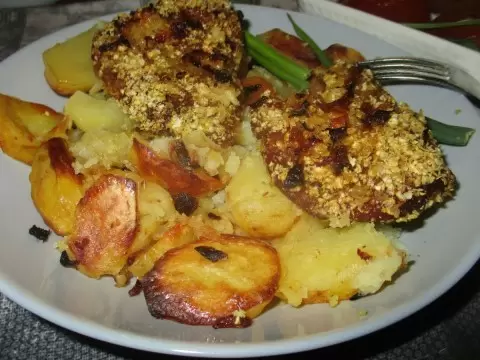 Параллельно, стоит заняться подготовкой овощей: лук нарезать и обжарить на сковороде до золотистой корочки. Картофель почистить, нарезать и выложить в рукав для запекания. После этого, обвалять каждый кусок свинины в кукурузных хлопьях с добавлением сушеных трав и разместить сверху на картошке.