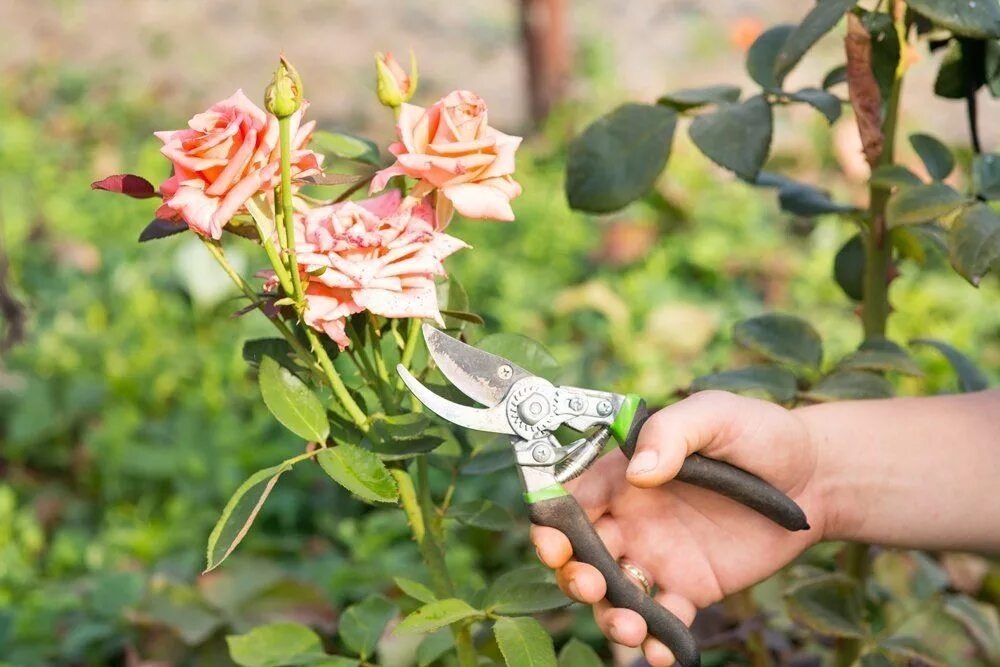 При обрезке чайно-гибридных роз следует удалять все отцветшие цветы вместе с частью стебля. Размер среза может варьироваться, но в среднем рекомендуется укорачивать на треть длины. У флорибунд начинается обрезка с удалением соцветий до ближайшего сильного листа. Плетистые и канадские розы требуют укорачивания только длинных побегов, а старые или слабые следует удалять полностью. У кустовых роз нет строгих правил по обрезке, однако увядшие цветы должны быть незамедлительно удалены, чтобы обеспечить максимальное цветение.