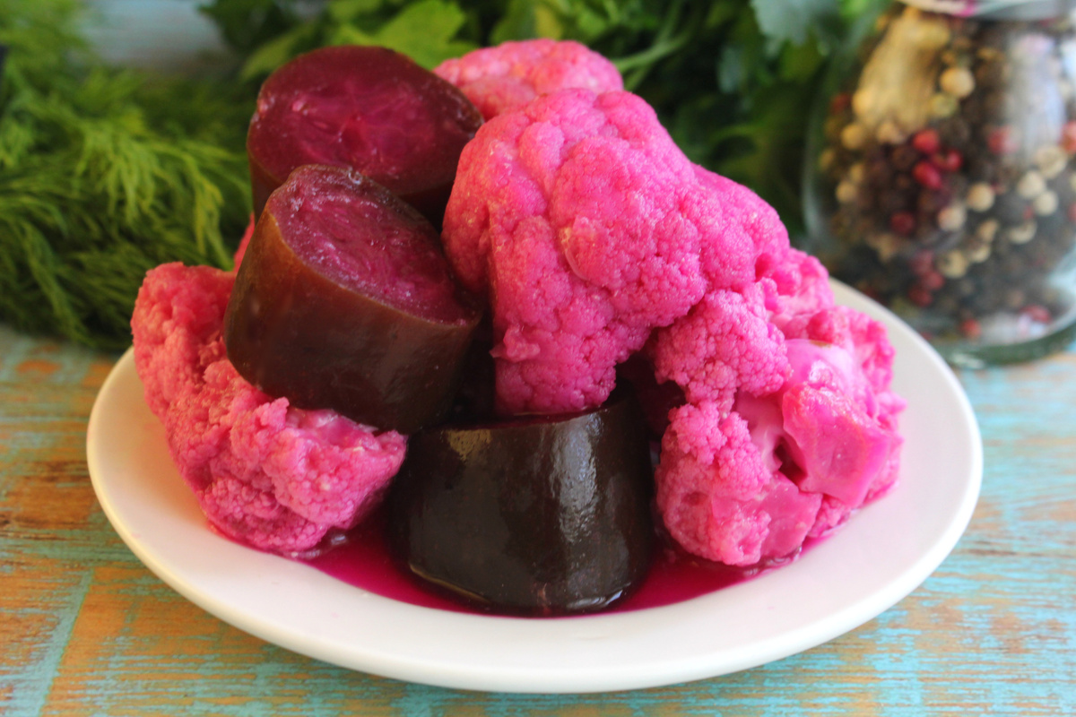 Первым делом следует подготовить овощи. Огурцы можно оставлять целыми, если они маленькие, либо нарезать толстыми кольцами. Свеклу очищают и нарезают произвольно, часть свеклы помещают в кастрюлю. Цветную капусту разобрать на соцветия нужного размера и выложить их сверху.